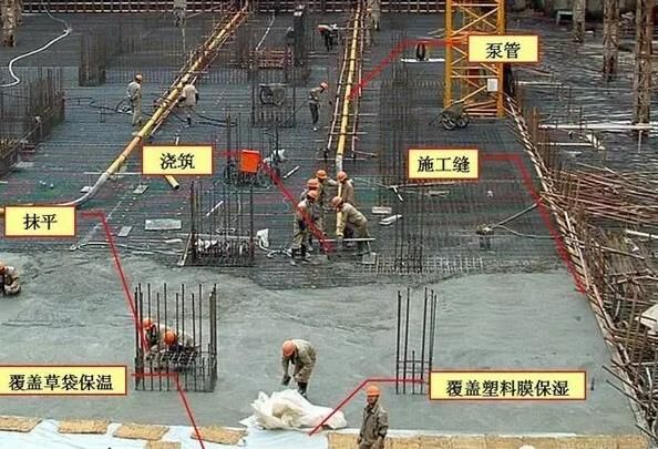 6、大體積泵送混凝土經(jīng)振搗后表面水泥漿較厚,容易引起表面裂縫。首先,要求在振搗最上一層混凝土?xí)r,控制振搗時(shí)間,注意避免表層產(chǎn)生太厚的浮漿層;在澆搗后,必須及時(shí)用2m 長(zhǎng)括尺,將多余浮漿層刮除,按照標(biāo)高控制點(diǎn),將混凝土表面括拍平整。有凹坑的部位必須用混凝土填平,在混凝土收漿接近初凝時(shí),混凝土面進(jìn)行二次抹光,用木蟹全面仔細(xì)打抹兩遍,既要確?;炷恋钠秸?,又要把其初期表面的收縮脫水細(xì)縫閉合,在混凝土收漿凝固施工期間,除了具體施工人員外,不得在未干硬的混凝土面上隨意行走,收漿工作完成的面必須同步及時(shí)覆蓋薄膜。