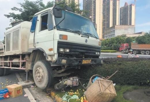 在泵車前的綠化帶上,散落著兩個(gè)大竹筐,筐內(nèi)裝著水果,路面遺落一雙拖鞋、一個(gè)破碎的安全頭盔及眾多摩托車零部件。