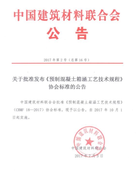 摘要:2017年7月,由中國混凝土與水泥制品協(xié)會(以下簡稱協(xié)會)組織制定的《預(yù)制混凝土箱涵工藝技術(shù)規(guī)程》和《混凝土用氧化鎂膨脹劑》兩項協(xié)會標準,通過審定并發(fā)布批準公告,標準號分別為CBMF 18-2017和CBMF 19-2017,將同時于2017年10月1日起實施。