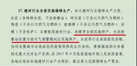 近日,環(huán)保部發(fā)布《京津冀及周邊地區(qū)2017-2018 年秋冬季大氣污染綜合治理攻堅(jiān)行動方案》,2017年10月至2018年3月,水泥(含特種水泥,不含粉磨站)、磚瓦窯(不含以天然氣為燃料)、陶瓷(不含以天然氣為燃料)、玻璃棉(不含以天然氣為燃料)、巖棉(不含電爐)、石膏板等建材行業(yè),采暖季全部實(shí)施停產(chǎn),水泥粉磨站在重污染天氣預(yù)警期間應(yīng)實(shí)施停產(chǎn)。
