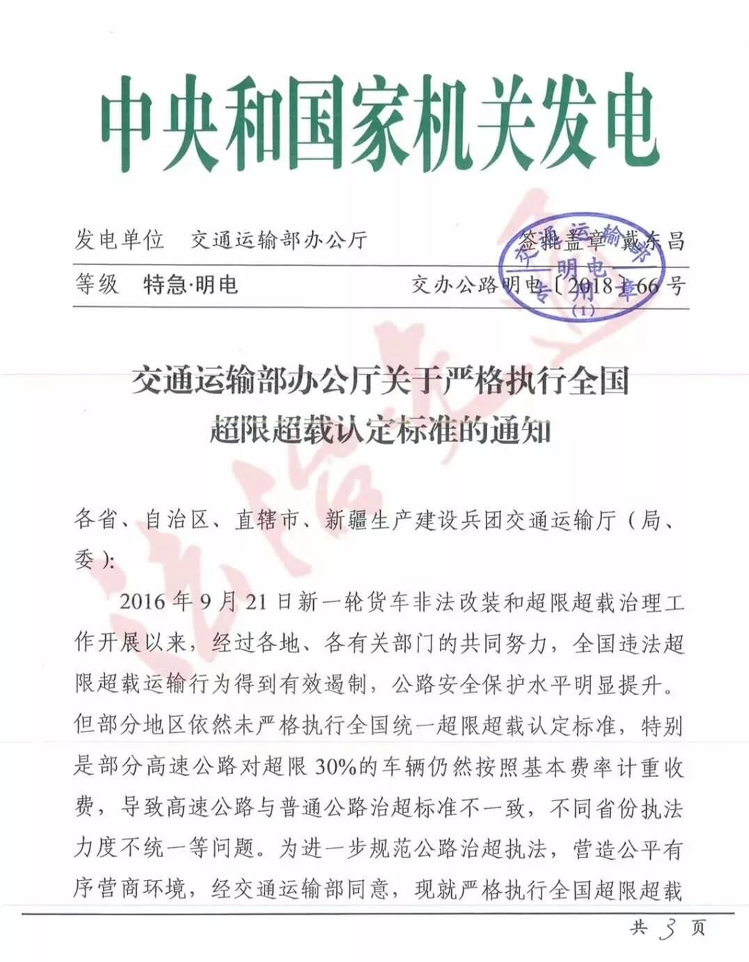 文件強(qiáng)調(diào):部分地區(qū)依然未嚴(yán)格執(zhí)行全國(guó)統(tǒng)一超限超載認(rèn)定標(biāo)準(zhǔn),部分高速公路對(duì)超限30%的車(chē)輛仍然按照基本費(fèi)率計(jì)重收費(fèi),導(dǎo)致高速公路與普通公路治超標(biāo)準(zhǔn)不一致,不同省份執(zhí)法力度不統(tǒng)一等問(wèn)題。未按標(biāo)準(zhǔn)執(zhí)行的地區(qū),9月底前全面整改。