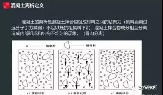 混凝土離析啊是混凝土是混凝土拌合物組成材料之間的一個黏聚力,(集料距離過遠(yuǎn)分子引力減弱)不足以抵抗粗集料下沉,混凝土拌合物成分互相分離,造成內(nèi)部組成結(jié)構(gòu)不均勻的現(xiàn)象。