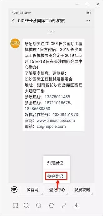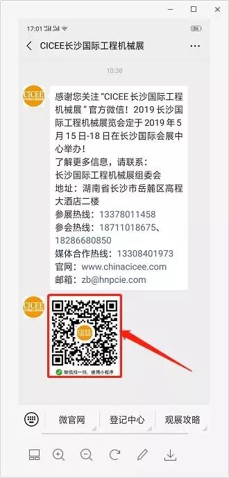 第1步,掃碼關(guān)注“CICEE長沙國際工程機(jī)械展”微信公眾號,點(diǎn)擊“參會(huì)登記”,獲取小程序二維碼。