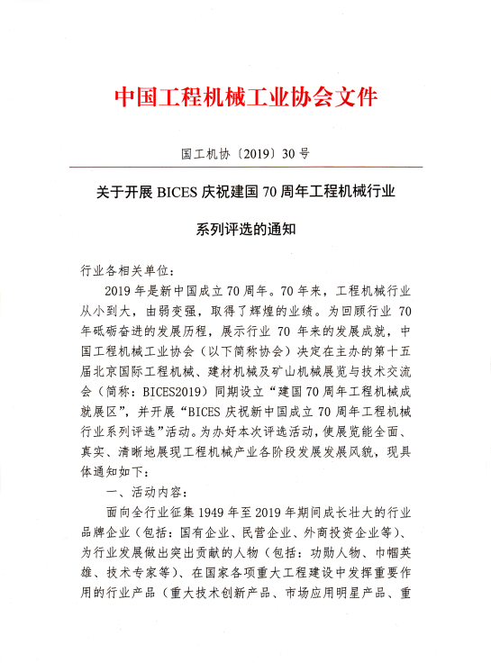 關(guān)于開展BICES慶祝建國70周年工程機(jī)械系列行業(yè)評選的通知