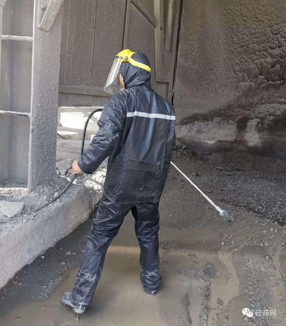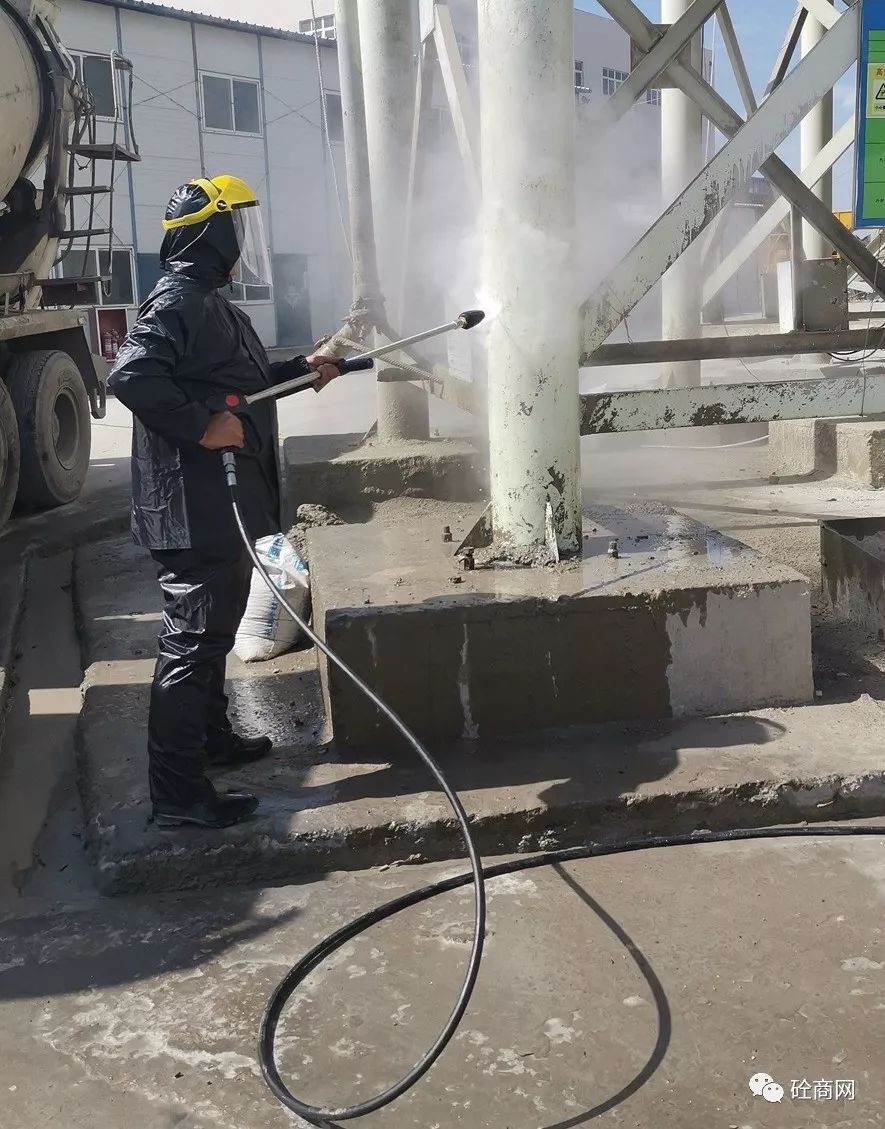 在楊技術(shù)員給站上工作人員進行初步講解指導后,首先對兩年沒有清理過的水泥倉支腿下方累積的混凝土進行了處理。那么,效果究竟怎么樣呢?具體視頻關(guān)注“砼商網(wǎng)”公眾號,回復“高壓清洗機”即可獲得技術(shù)員正準備打攪拌機主樓容易噴濺混凝土的地方時該攪拌站站長說道,這可得有兩年沒清理過的混凝土結(jié)塊,十幾公分厚呀!你們這高壓清洗機能打掉嗎?這是混凝土??!這么長時間了,還這么厚,打不下去怎么辦?正在小編心里打鼓的時候,楊技術(shù)員說道,沒問題,放心吧!