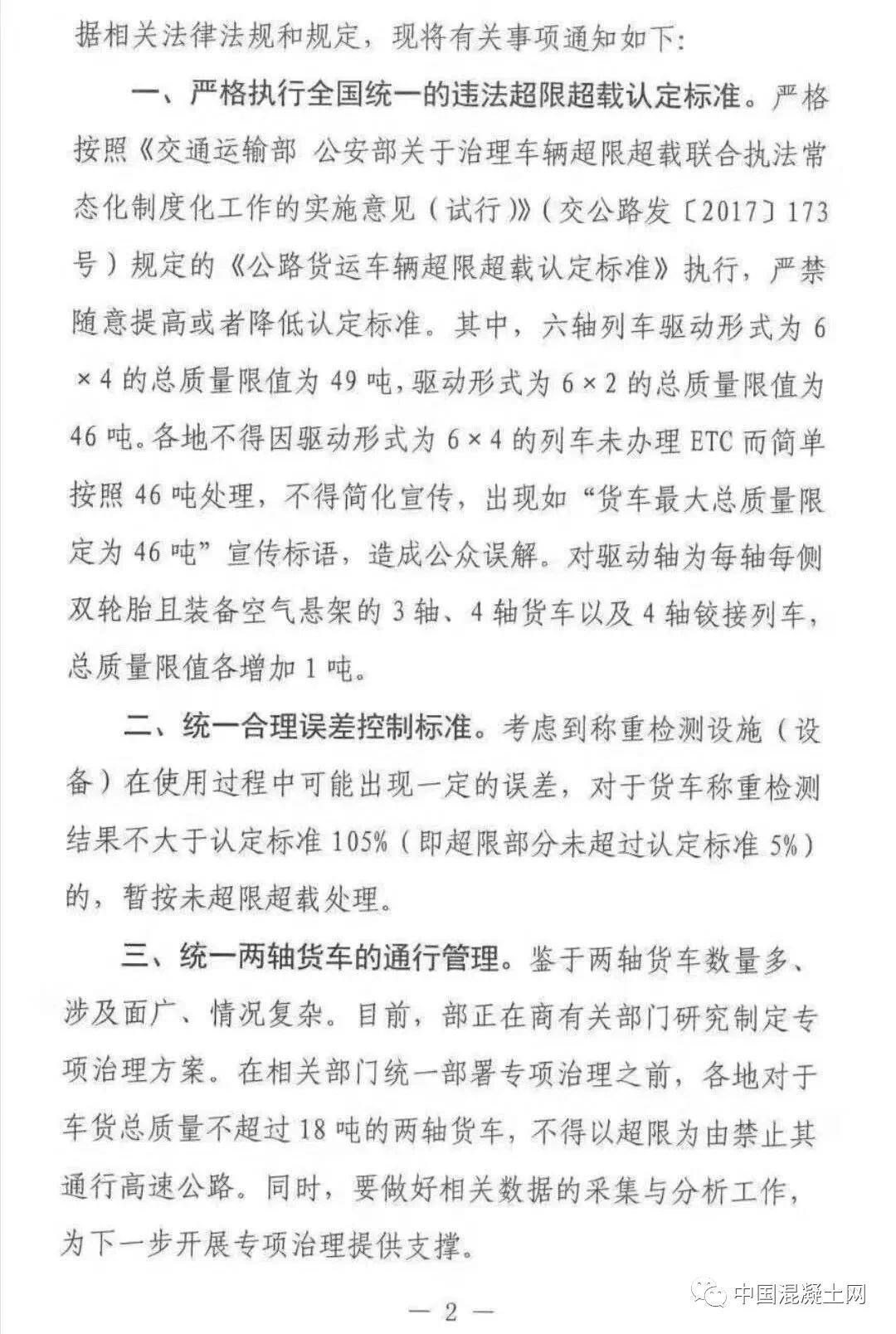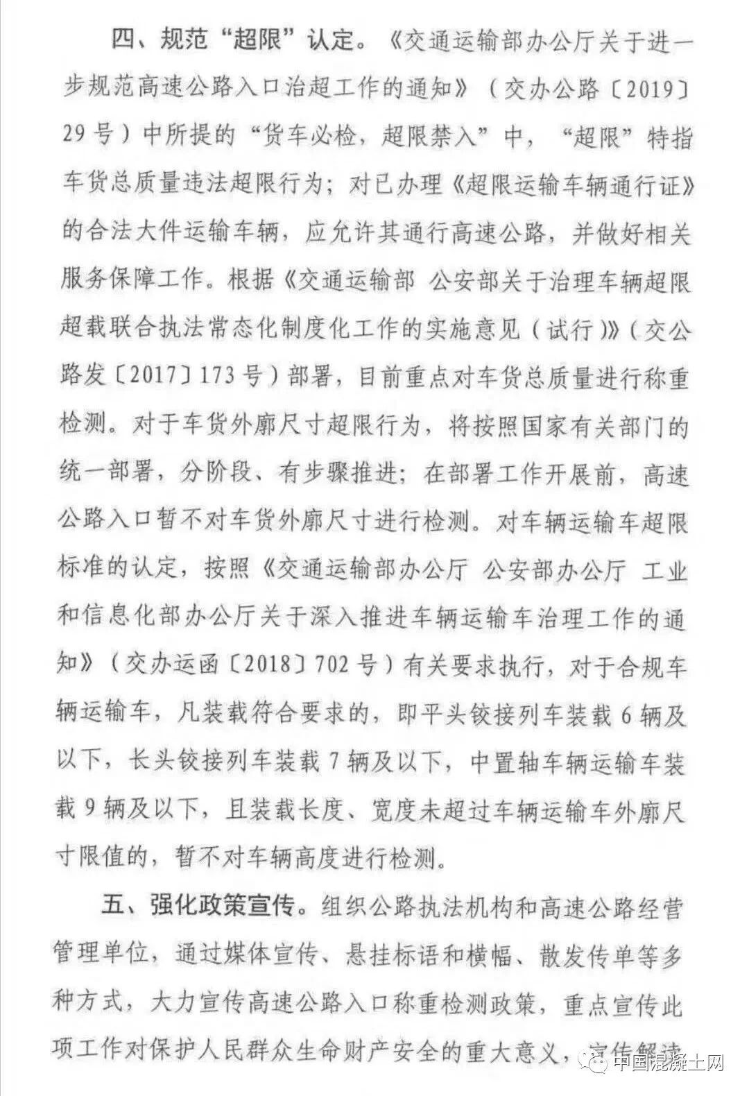 一、嚴(yán)格執(zhí)行全國(guó)統(tǒng)一的違法超限超載認(rèn)定標(biāo)準(zhǔn)。嚴(yán)格按照《交通運(yùn)輸部 公安部關(guān)于治理車輛超限超開車聯(lián)合執(zhí)法常態(tài)化制度化工作的實(shí)施意見 (試行)》(交公路發(fā)【2017】173號(hào))規(guī)定的《公路貨運(yùn)車輛超限超載認(rèn)定標(biāo)準(zhǔn)》執(zhí)行,嚴(yán)禁隨意提高或者降低認(rèn)定標(biāo)準(zhǔn)。其中,六軸列車驅(qū)動(dòng)形式為6×4的總質(zhì)量限值為49噸,驅(qū)動(dòng)形式為6×2的總質(zhì)量限值為46噸。各地不得因驅(qū)動(dòng)形式為6×4人列車未辦理ETC而簡(jiǎn)單按照46噸處理,不得簡(jiǎn)化宣傳,出現(xiàn)如“貨車最大總質(zhì)量限定為46噸”宣傳標(biāo)語(yǔ),造成公眾誤解。對(duì)驅(qū)動(dòng)軸為每軸每則雙輪胎且裝備空氣懸架的3軸、車軸貨車以及4軸鉸接列車總質(zhì)量限值各增加1噸。二、統(tǒng)一合理誤差控制標(biāo)準(zhǔn)。考慮到稱重檢測(cè)設(shè)施(設(shè)備)在使用過程中可能出現(xiàn)一定的誤差,對(duì)于貨車稱重檢測(cè)結(jié)果不大于認(rèn)定標(biāo)準(zhǔn)105%(即超限部分未直如過認(rèn)定標(biāo)準(zhǔn)的5%)的,暫按未超限超載處理。鑒于兩軸貨車數(shù)量多、涉及面廣、情況復(fù)雜。目前,部正在商有關(guān)部門研究制定專項(xiàng)治理方案。在相關(guān)部門統(tǒng)一部署專項(xiàng)治理之前,各地對(duì)于車貨總質(zhì)量不超過18噸的兩軸貨車,不得以超限為由禁止其通行高速公路。同時(shí),要做好相關(guān)數(shù)據(jù)的采集與分析工作,為下一步開展專項(xiàng)治理提供支撐。《交通運(yùn)輸部辦公室廳關(guān)于進(jìn)一步規(guī)范高速公路入口治超工作的通知》(交辦公路【2019】29號(hào))中所提的“貨車必檢,超限禁入”中,“超限”特指車貨總質(zhì)量違法超限行為;對(duì)已辦理《超限運(yùn)輸車輛通行證》的合法大件運(yùn)輸致車輛,應(yīng)允許其通行高速公路,并做好相關(guān)服務(wù)保障工作。根據(jù)《交通運(yùn)輸部 公安部關(guān)于治理車輛超限超載聯(lián)合執(zhí)法常態(tài)化制度化工作的實(shí)施意見(試行)》(交公路發(fā)【2017】173號(hào))部署,目前重點(diǎn)對(duì)車貨總質(zhì)量進(jìn)行稱重檢測(cè)。對(duì)于車貨外廓尺寸超限行為,將按照國(guó)家有關(guān)部門的統(tǒng)一部署,分階段、有步驟推進(jìn);在部署工作開展前,高速公路入口暫不對(duì)車貨外廓尺寸進(jìn)行檢測(cè)。對(duì)車輛運(yùn)輸超限標(biāo)準(zhǔn)的認(rèn)定,按照《交通運(yùn)輸 部辦公室廳 公安部辦公室廳 工業(yè)和信息化部辦公室廳關(guān)于深入推進(jìn)車輛運(yùn)輸車治理工作的通知》(交辦運(yùn)【2018】702號(hào))有關(guān)要求執(zhí)行,對(duì)于合規(guī)車輛運(yùn)輸車,凡裝載符合要求的,即平頭鉸接列車裝載6輛及以下,長(zhǎng)頭鉸接列車裝載7輛及以下,中置軸車輛運(yùn)輸車裝載9輛及以下,且裝載長(zhǎng)度、寬度未超過車輛運(yùn)輸車外廓尺寸限值的,暫不對(duì)車輛高度進(jìn)行檢測(cè)。組織公路執(zhí)法機(jī)構(gòu)和高速公路經(jīng)營(yíng)管理單位,通過媒體宣傳、懸掛標(biāo)語(yǔ)和橫幅、散發(fā)傳單等多種方式,大力宣傳高速公路入口稱重檢測(cè)政策,重點(diǎn)宣傳此項(xiàng)工作對(duì)保護(hù) 人民群眾生命財(cái)產(chǎn)安全的重大意義 ,宣傳解讀治超政策、治超標(biāo)準(zhǔn),爭(zhēng)取廣大貨運(yùn)企業(yè)和貨車車主了解政策、熟悉政策,支持政策實(shí)施。要利用稱重檢測(cè)環(huán)節(jié),逐車提醒、提示貨車司機(jī),盡快安裝ETC,充分享受便捷通行、交費(fèi)打折、加油優(yōu)惠、車便利等各種政策紅利,促進(jìn)物流提質(zhì)增效。未盡事宜,按照《超限運(yùn)輸車輛行駛公路管理規(guī)定》和173號(hào)文件等有關(guān)規(guī)定執(zhí)行。各地執(zhí)行過程中出現(xiàn)的要及時(shí)報(bào)部。全國(guó)物流標(biāo)準(zhǔn)非?;靵y,地方標(biāo)準(zhǔn)與國(guó)家標(biāo)準(zhǔn)經(jīng)?!按蚣堋保瑢?dǎo)致全國(guó)物流司機(jī)苦不堪言,而此次交通廳像各省運(yùn)輸廳發(fā)布特急文件通知,劍指就是統(tǒng)一運(yùn)輸車輛載重的標(biāo)準(zhǔn),令運(yùn)輸行業(yè)向制度化,規(guī)范化過渡。同時(shí)從根源上徹底清除“亂收費(fèi)”現(xiàn)象,并發(fā)布問題反映電話:部科學(xué)研究院:陳宓 18600797358部規(guī)劃院:張新虎 13811681357部路網(wǎng)中心:李友良 15522515653