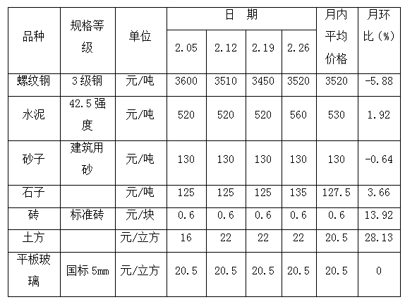 受春節(jié)假期和新冠肺炎疫情影響,2月份山東省濟(jì)寧市黃河灘區(qū)遷建物資市場(chǎng)交易量明顯減少,價(jià)格變動(dòng)整體漲跌互現(xiàn)。與上月相比,7種黃河灘遷建物資價(jià)格呈4升2降1平態(tài)勢(shì)。其中,螺紋鋼的價(jià)格震蕩下行,水泥的價(jià)格穩(wěn)中有漲,砂子、磚和平板玻璃的價(jià)格月內(nèi)平穩(wěn)運(yùn)行,石子的價(jià)格受季節(jié)性供應(yīng)減少影響小幅上升,土方的價(jià)格呈現(xiàn)高位整理態(tài)勢(shì)。螺紋鋼方面,截止到2月26日,濟(jì)寧市梁山縣監(jiān)測(cè)的螺紋鋼市場(chǎng)批發(fā)價(jià)格為3520元/噸,價(jià)格下降明顯。由于目前特殊時(shí)期,貨運(yùn)受阻且下游企業(yè)復(fù)工進(jìn)度開展緩慢,短期內(nèi)需求仍然偏弱,市場(chǎng)整體成交冷清,庫存和資金壓力逐步增加,供給壓力放大,商家對(duì)于后市心態(tài)偏空,處于悲觀情緒,市場(chǎng)整體處于有價(jià)無市狀態(tài)。