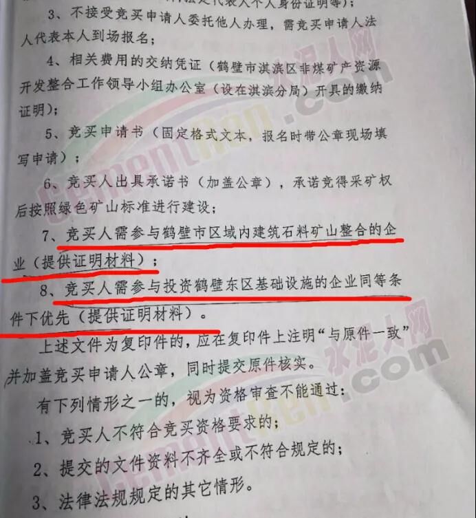但是,該企業(yè)在參與競標(biāo)時(shí)確被駁回,理由是竟買人需參與鶴壁市區(qū)域內(nèi)建筑石料礦山整合的企業(yè)(提供證明材料);同時(shí)要滿足競買人需參與投資鶴壁東區(qū)基礎(chǔ)設(shè)備的企業(yè)同等條件優(yōu)先(提供證明材料)。不屬于鶴壁市的企業(yè)或者沒有參于鶴壁市區(qū)域礦山整合的企業(yè)是不能參與競標(biāo),這與公告中的強(qiáng)調(diào)的價(jià)高者得完全不符。