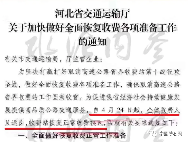 據(jù)中國(guó)砂石協(xié)會(huì)和中國(guó)砂石網(wǎng)了解,日前,河北省交通運(yùn)輸廳發(fā)布《關(guān)于加快做好全面恢復(fù)收費(fèi)各項(xiàng)準(zhǔn)備工作的通知》稱為堅(jiān)決打贏打好取消高速公路省界收費(fèi)站第十戰(zhàn)役攻堅(jiān)戰(zhàn),做好全面恢復(fù)收費(fèi)各項(xiàng)準(zhǔn)備工作,確保取消高速公路省界收費(fèi)站工作圓滿收官,為促進(jìn)全省經(jīng)濟(jì)社會(huì)持續(xù)健康發(fā)展提供高品質(zhì)公路交通服務(wù),自4月24日起,全體收費(fèi)人員返崗,收費(fèi)站恢復(fù)正常收費(fèi)模式。