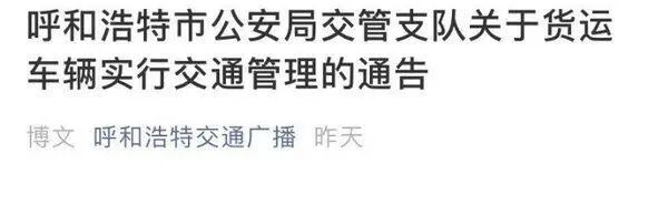 日前,呼和浩特市公安局交管支隊發(fā)布通告表示:6月28日起,對貨運(yùn)車輛采取交通管理措施。