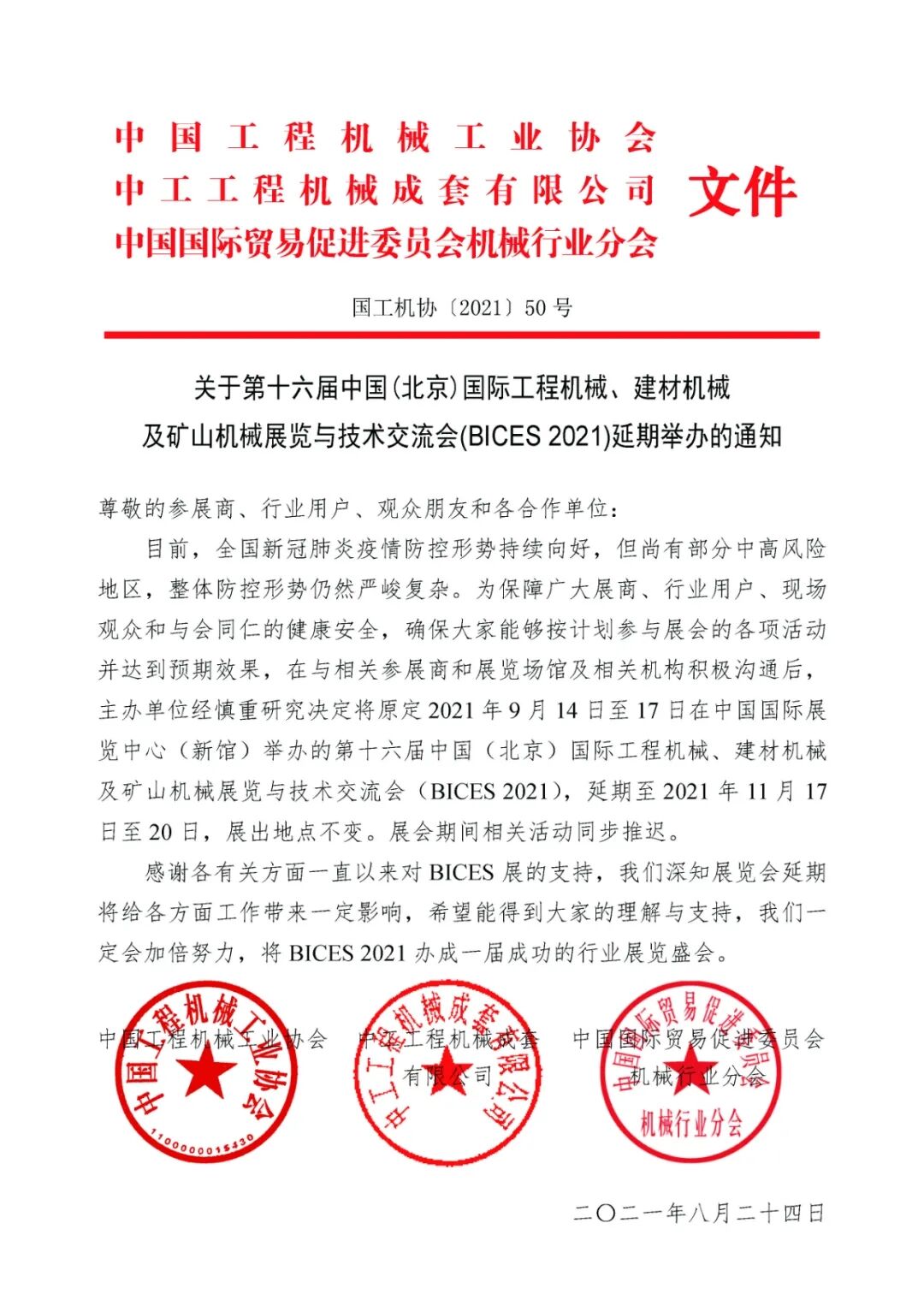 關(guān)于第十六屆北京工程機械展BICES 2021延期舉辦的通知