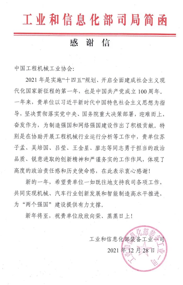 近日,工業(yè)和信息化部裝備工業(yè)一司致函中國工程機(jī)械工業(yè)協(xié)會(huì),對(duì)協(xié)會(huì)一年來,堅(jiān)持以習(xí)近平新時(shí)代中國特色社會(huì)主義思想為指導(dǎo),堅(jiān)決貫徹落實(shí)黨中央、國務(wù)院重大決策部署,迎難而上,奮發(fā)作為,在制造強(qiáng)國和網(wǎng)絡(luò)強(qiáng)國建設(shè)工作,特別是積極配合協(xié)助開展工程機(jī)械行業(yè)運(yùn)行分析等工作表示感謝!
