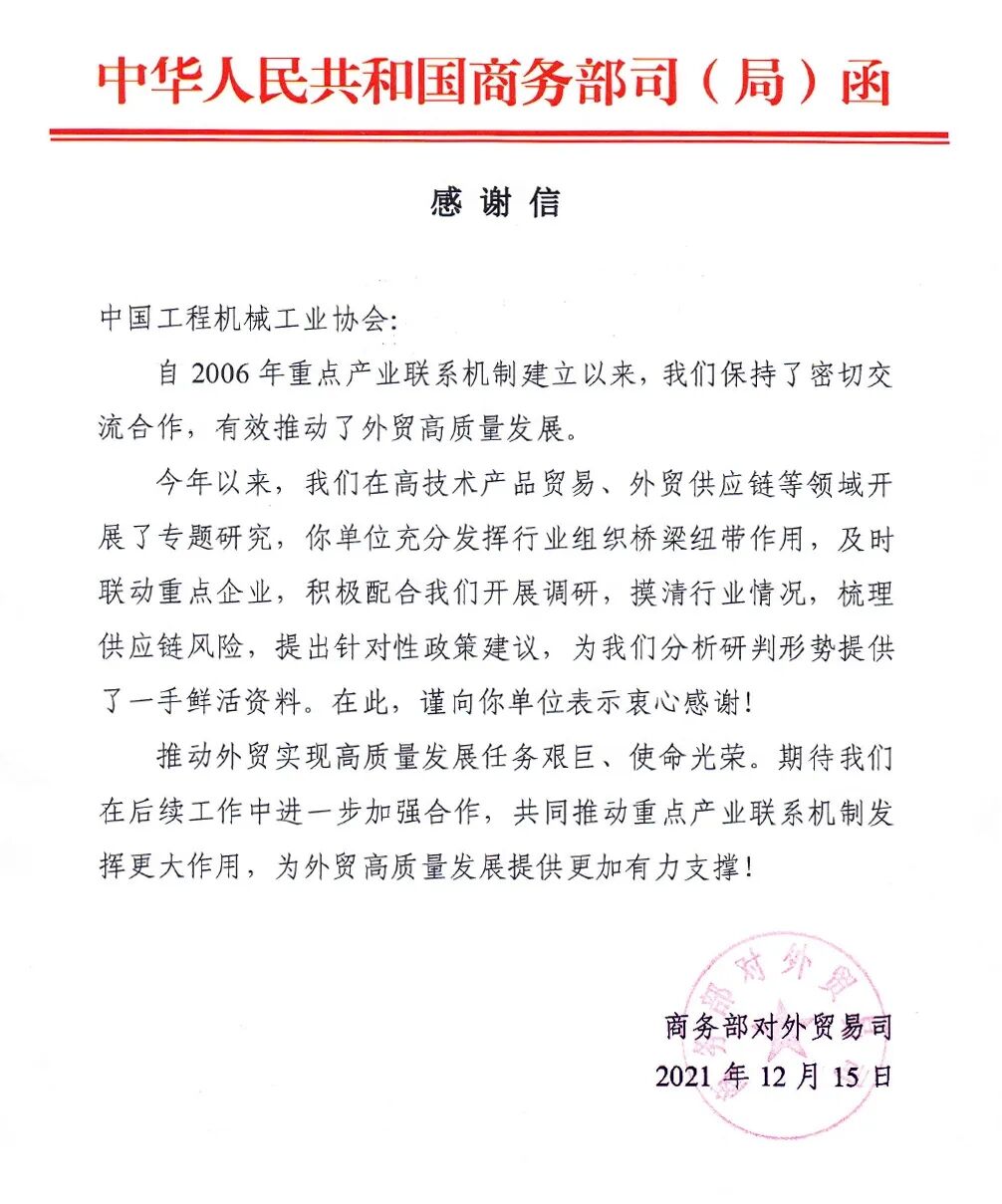 近日,商務(wù)部對外貿(mào)易司致函中國工程機(jī)械工業(yè)協(xié)會,就協(xié)會今年以來,積極配合商務(wù)部對外貿(mào)易司在高技術(shù)產(chǎn)品貿(mào)易、外貿(mào)供應(yīng)鏈等領(lǐng)域開展了專題研究,收集、整理了大量的行業(yè)外貿(mào)進(jìn)出口情況,受到了高度的肯定。并指出,協(xié)會充分發(fā)揮行業(yè)組織橋梁紐帶作用,及時(shí)聯(lián)動重點(diǎn)企業(yè),積極配合商務(wù)部對外貿(mào)易司開展調(diào)研,摸清行業(yè)情況,梳理供應(yīng)鏈風(fēng)險(xiǎn),提出針對性政策建議,為商務(wù)部對外貿(mào)易司分析研判形勢提供了一手鮮活資料。在此,謹(jǐn)向協(xié)會表示衷心感謝!