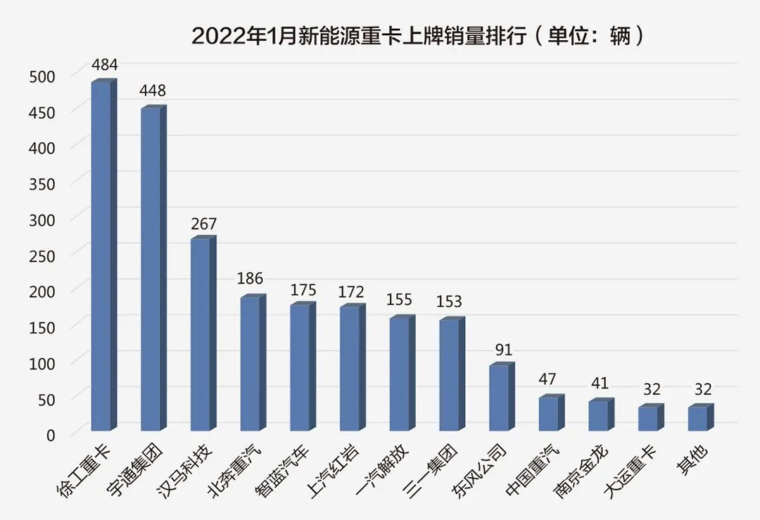 特別是在企業(yè)銷量排行榜上,表現(xiàn)最為搶眼的并不是傳統(tǒng)重卡制造商,而是工程機械企業(yè)跨行業(yè)進軍重卡行業(yè)的典型代表——三一汽車與徐工汽車:三一新能源重卡2021年累計銷量達到1497輛,同比大增1621%,市場份額達到14.33%,較上年同期提升了11個百分點;徐工在2022年1月21.2%的月度占有率火熱開局,問鼎新能源重卡2022首月銷冠。