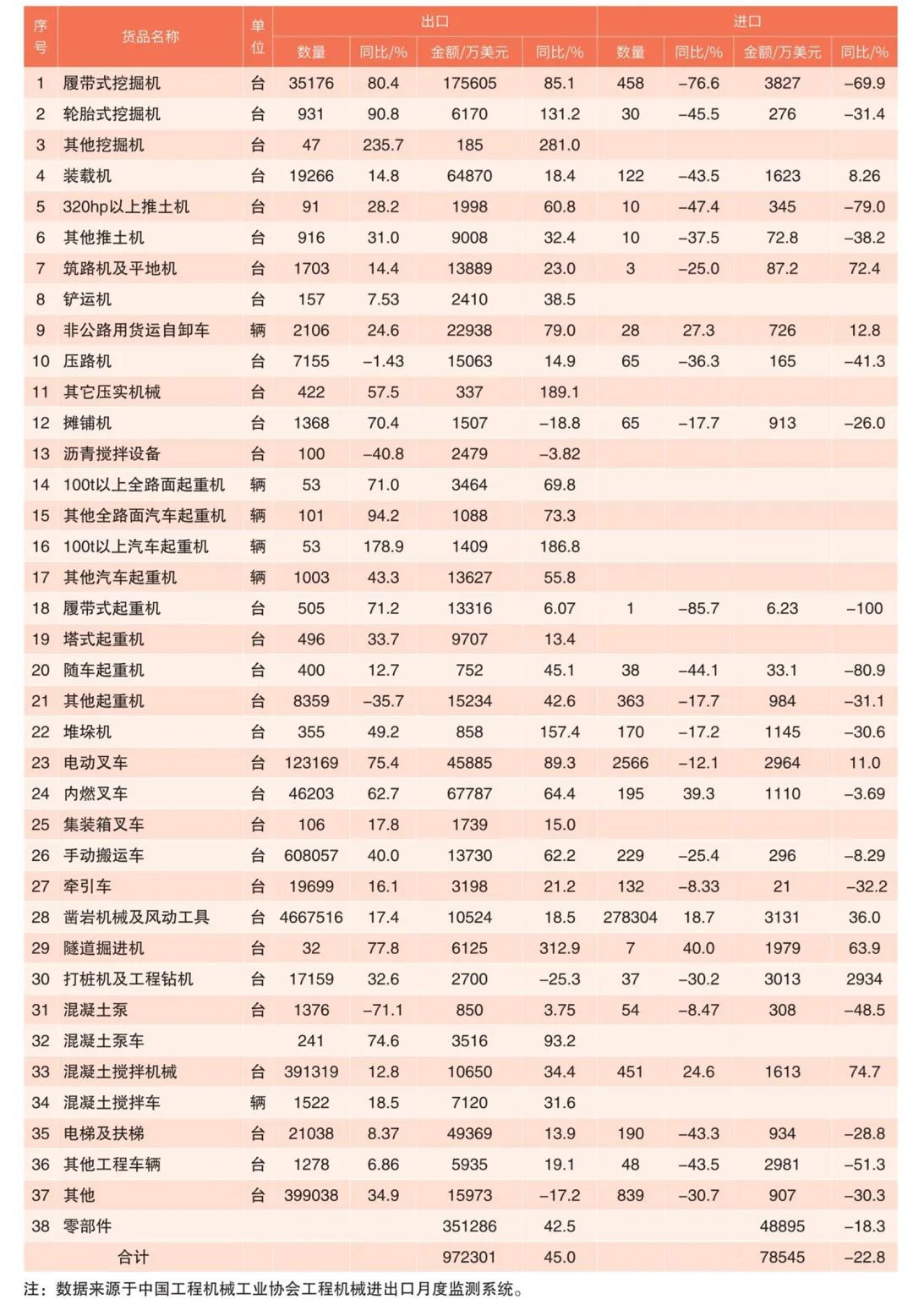 表4 2022年1-3月工程機(jī)械產(chǎn)品進(jìn)出口分類匯總