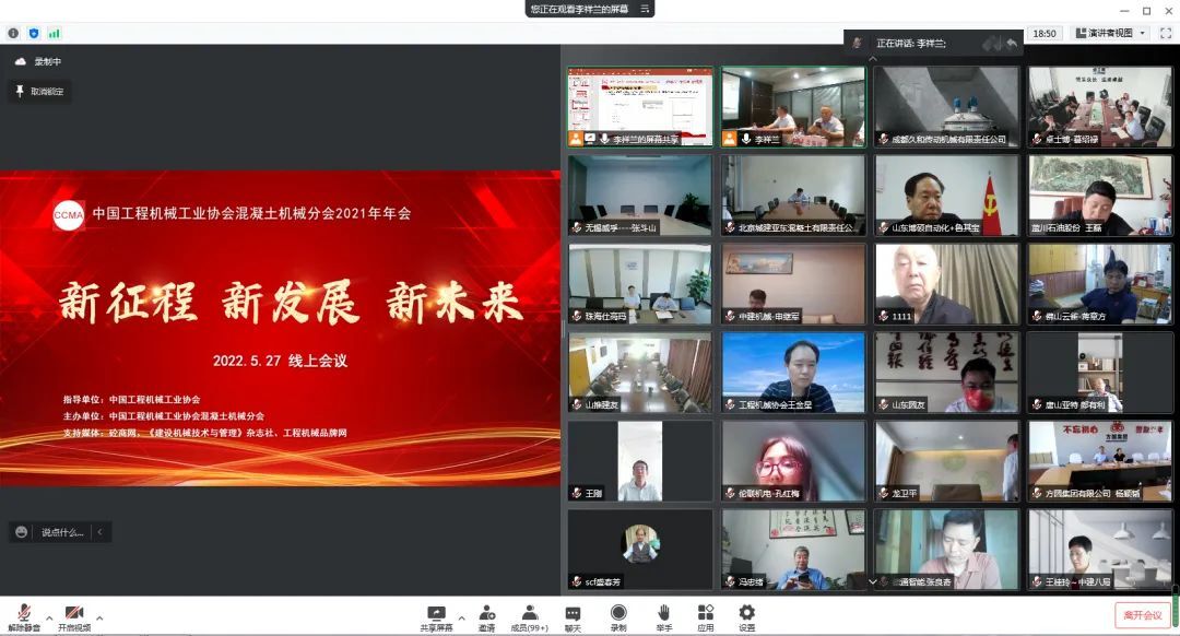 2022年5月27日,以“新征程 新發(fā)展 新未來 ”為主題的中國工程機械工業(yè)協(xié)會混凝土機械分會年會在線上隆重召開。中國工程機械工業(yè)協(xié)會會長蘇子孟、名譽會長祁俊、協(xié)會顧問龍國鍵、副秘書長呂瑩、副秘書長王金星、副秘書長尹曉荔、其他分支機構領導、混凝土機械分會會長符忠軒、名譽會長盛春芳、秘書長李祥蘭、顧問易君、分會秘書處、分會理事及會員單位相關負責人、行業(yè)上下游企業(yè)與行業(yè)專家等在內的兩百余人參與此次會議。