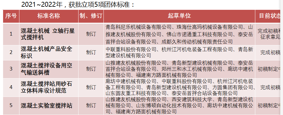 以市場需求為導(dǎo)向,圍繞產(chǎn)品鏈,今年重點從“關(guān)鍵部件/系統(tǒng),新材料、新能源,智能產(chǎn)品、智能互聯(lián)”方1立項團體標(biāo)準(zhǔn),引導(dǎo)和服務(wù)混凝十機械行、發(fā)展。 2022年擬申請團體標(biāo)準(zhǔn)立項10項以上。