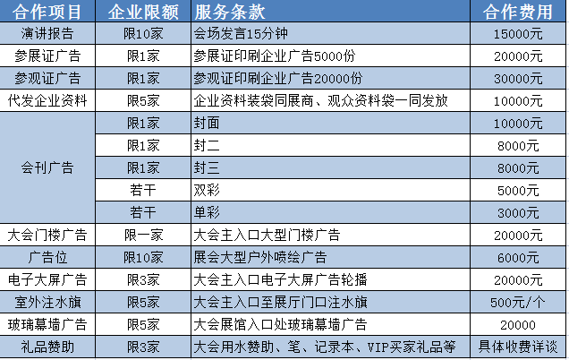八、合作方式:我們誠(chéng)摯邀請(qǐng)并期待您的參與,合作方式包括但不僅限于:企業(yè)演講、參展證廣告、參觀證廣告、會(huì)刊廣告、戶外廣告位、注水旗、電子大屏、玻璃幕墻廣告、大會(huì)門樓廣告、禮品贊助、晚宴贊助等