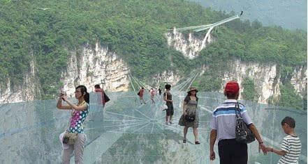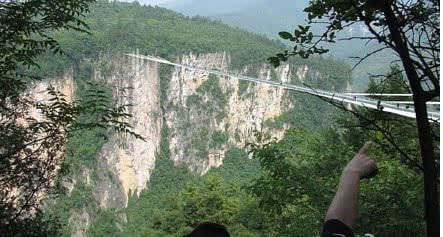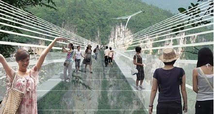 號(hào)稱(chēng)世界最長(zhǎng)、最高的全透明玻璃橋———據(jù)遺產(chǎn)日?qǐng)?bào): 張家界大峽谷玻璃橋?qū)⒂?月向游客開(kāi)放。玻璃橋總長(zhǎng)430米、寬6米,橋面距谷底約300米,可站800人。整個(gè)工程無(wú)鋼筋混凝土橋墩,同時(shí)肩負(fù)蹦極、溜索、舞臺(tái)等多種功能。