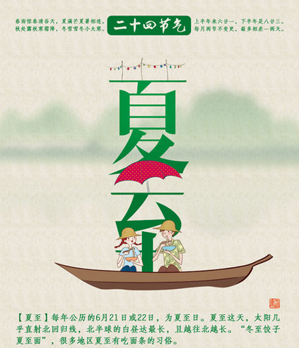 夏至是二十四節(jié)氣中最早被確定的一個節(jié)氣。公元前七世紀(jì),先人采用土圭測日影,就確定了夏至。每年的夏至從6月21日(或22日)開始,至7月7日(或8日)結(jié)束。據(jù)《恪遵憲度抄本》:“日北至,日長之至,日影短至,故曰夏至。至者,極也?!毕闹吝@天,太陽直射地面的位置到達(dá)一年的最北端,幾乎直射北回歸線(北緯23°26\'),北半球的白晝達(dá)最長,且越往北晝越長。如海南的??谑羞@天的日長約13小時多一點(diǎn),杭州市為14小時,北京約15小時,而黑龍江的漠河則可達(dá)17小時以上。夏至以后,太陽直射地面的位置逐漸南移,北半球的白晝?nèi)諠u縮短。民間有“吃過夏至面,一天短一線”的說法。而此時南半球正值隆冬。