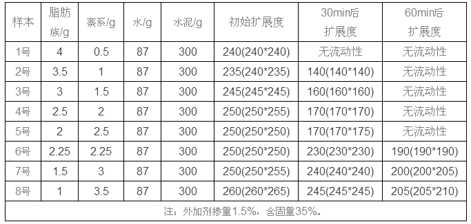 筆者將通過脂肪族與萘系復(fù)配,探討與淮南“海螺牌”水泥的適應(yīng)性實(shí)驗(yàn),對(duì)比兩者的優(yōu)略,從不同的比例中找出效果理想且經(jīng)濟(jì)實(shí)用的最優(yōu)組合。本次實(shí)驗(yàn)所用的淮南“海螺牌”水泥的熟料使用新型干法旋窯生產(chǎn)P.O42.5普通硅酸鹽水泥,其中三氧化硫含量為2.09%;氧化鎂含量為1.91%;氯離子含量為0.016%;混合材品種為碎屑+煤矸石,摻量12.53%;石膏為脫硫石膏,摻量4.97%,水泥初凝170min,終凝220min。脂肪族為某單位生產(chǎn)的普通脂肪族外加劑,固含量為35%,減水率24%,密度1.195g/cm3。萘系為袋裝萘粉,稀釋到含固量為35%(含固量與脂肪族的相同,方便做對(duì)比實(shí)驗(yàn))。脂肪族外加劑(免加熱型)在合成過程中使用氫氧化鈉提供熱源,導(dǎo)致脂肪族外加劑含堿量相對(duì)較高;而萘系在合成過程中,首先加入濃硫酸磺化,在水解中和反應(yīng),因而萘系外加劑中硫酸根離子含量相對(duì)較高。