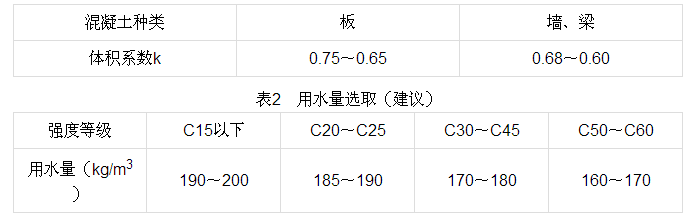 進(jìn)行配合比設(shè)計(jì)前,首先測(cè)出水泥、摻合料、砂、石等各種原材料的表觀密度和石子的振實(shí)密度。以石子的振實(shí)密度乘以體積系數(shù)即為石子的單方用量,石子體積系數(shù)可按表1選取。根據(jù)原材料情況和混凝土配制強(qiáng)度,用水量可按照經(jīng)驗(yàn)或按照表2選取。
