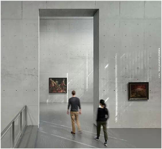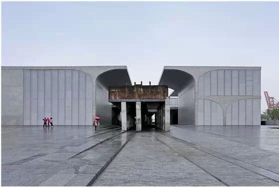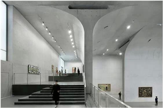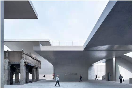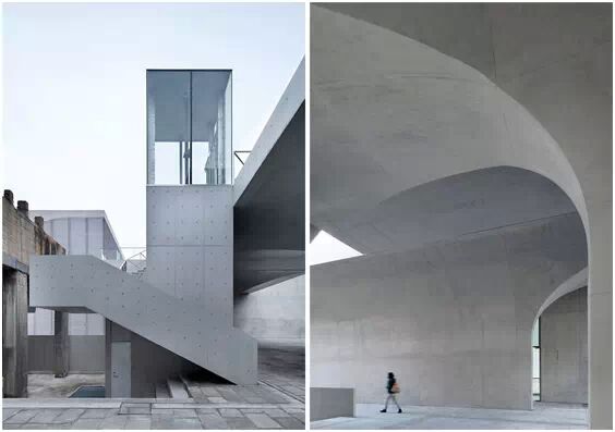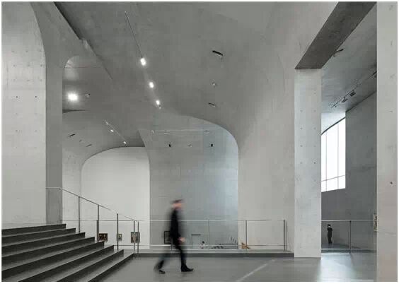 在“傘拱”結(jié)構(gòu)的空腔里,地面以上的“傘拱”覆蓋空間,墻體和天花均為清水混凝土的表面,它們的幾何分界位置也變得模糊。這樣的結(jié)構(gòu)性空間,在形態(tài)上不僅對人的身體形成庇護(hù)感,亦與保留的江邊碼頭的煤料斗產(chǎn)生視覺呼應(yīng)。建筑的內(nèi)部空間也得以呈現(xiàn)一種原始的野性魅力,而有著大小調(diào)節(jié)的空間尺度以及留有模板拼縫和螺栓孔的清水混凝土表面又會(huì)帶來一種現(xiàn)實(shí)感。這種“直白”式的結(jié)構(gòu)、材料、空間所形成的直接性與樸素性,加上大尺度出挑所產(chǎn)生的力量感或輕盈感,使整個(gè)建筑與原有場地的工業(yè)特質(zhì)間取得一種時(shí)間與空間的接續(xù)關(guān)系。地面以上的清水混凝土“傘拱”下的流動(dòng)展覽空間和地下一層傳統(tǒng)“白盒子”式的展覽空間由一個(gè)呈螺旋回轉(zhuǎn)、層層跌落的階梯空間聯(lián)接,既原始又現(xiàn)實(shí)的空間和古代、近代、現(xiàn)代直到當(dāng)代藝術(shù)的展覽陳列,這種并置的張力,呈現(xiàn)出一種具有時(shí)間性的展覽空間。