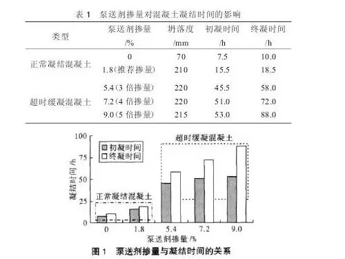在預拌混凝土生產(chǎn)與施工中,為了保持預拌混凝土在一定時間內(nèi)擁有良好的工作性能,一般要使用含緩凝組分的泵送劑。如果由于某種原因造成泵送劑摻量過大,就可能出現(xiàn)已澆筑的混凝土凝結(jié)時間超過預期的問題。通常將混凝土凝結(jié)時間超過設(shè)計預期凝結(jié)時間(一般在2 d以上)的現(xiàn)象稱之為超時緩凝現(xiàn)象。這與有意延長混凝土凝結(jié)時間不同,因為施工要求長時間緩凝是設(shè)計預期的、可控制的。而混凝土超時緩凝是一種意外,是在混凝土生產(chǎn)澆筑過程中難于發(fā)現(xiàn)的,往往要在澆筑完畢一兩天工人拆模時才發(fā)現(xiàn)。實際上,隨著預拌混凝土用量不斷擴大,超時緩凝問題在使用預拌混凝土的工程中時有發(fā)生。