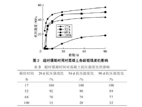 通過試驗研究發(fā)現(xiàn),超時緩凝問題顯著影響混凝土的終凝時間、各齡期強度和混凝土塑性收縮,結(jié)果表明:終凝時間越長混凝土各齡期強度越低,并且發(fā)生超時緩凝現(xiàn)象會顯著提高混凝土塑性收縮。判斷和處理混凝土工程中超時緩凝質(zhì)量問題時,可根據(jù)混凝土的超時緩凝時間和配制強度進行判斷和處理,對于超時緩凝在2~3d的混凝土,其28 d強度可達到設(shè)計強度要求;而超時緩凝在4d及以上的混凝土,其28d強度無法達到計強度要求。