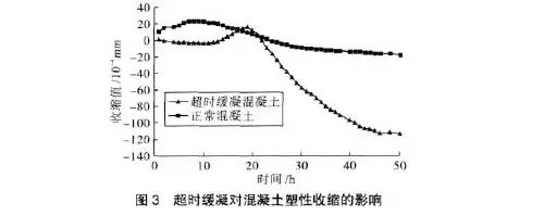 試驗以C30混凝土為研究對象,采用CABR-NES型非接觸式混凝土收縮變形測定儀,對比研究超時緩凝對混凝土塑性收縮的影響,試驗結(jié)果見圖3。