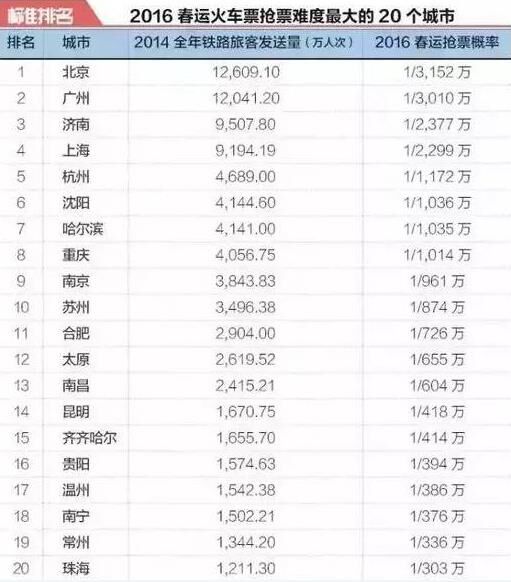 按照以上方法,標(biāo)準(zhǔn)排名在50個城市的數(shù)據(jù)基礎(chǔ)上,統(tǒng)計出了“2016春運火車票搶票難度最大的20個城市”。其中,擁有大量外來人口的北京,當(dāng)仁不讓成為了出發(fā)地最難買票的城市;打工圣地廣州,位列第二;濟南作為人口大省山東的省會,位列第三;上海和杭州緊隨其后,位列第四和第五;沈陽、哈爾濱、重慶、南京、蘇州、合肥、太原、南昌、昆明、齊齊哈爾、貴陽、溫州、南寧、常州和珠海分別進入前20強,入榜城市鐵路旅客發(fā)送量均超過1000萬人次。
