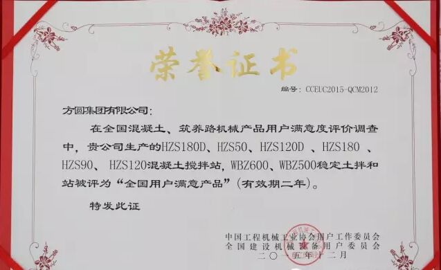方圓集團憑借在售后服務領(lǐng)域的突出表現(xiàn),榮獲“用戶滿意服務單位”的稱號,同時,方圓集團生產(chǎn)的HZS180D、HZS50、HZS120D、HZS180、HZS90、HZS120型混凝土攪拌站,WBZ600、WBZ500型穩(wěn)定土拌和站被評為“全國用戶滿意產(chǎn)品”。