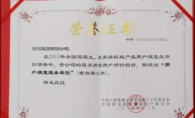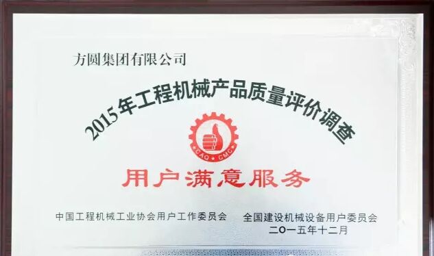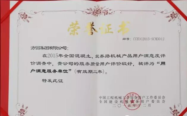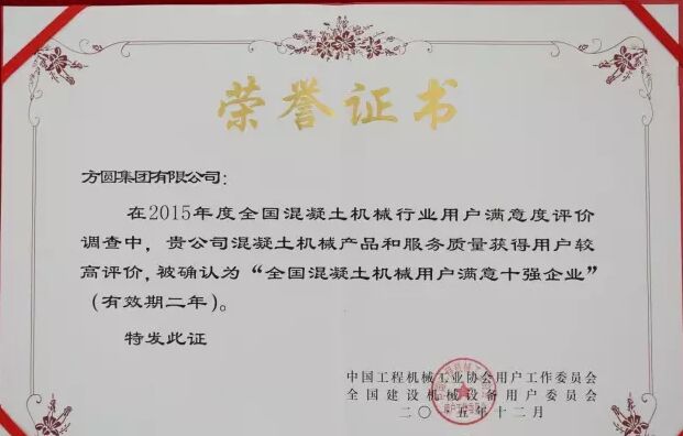 此外,因為方圓集團在2015年度全國混凝土機械行業(yè)用戶滿意度評價調(diào)查中,受到廣大用戶的一致好評,被授予“全國混凝土機械用戶滿意十強企業(yè)”稱號。在產(chǎn)品質(zhì)量調(diào)查中,連續(xù)七次被評為“全國用戶滿意單位”。