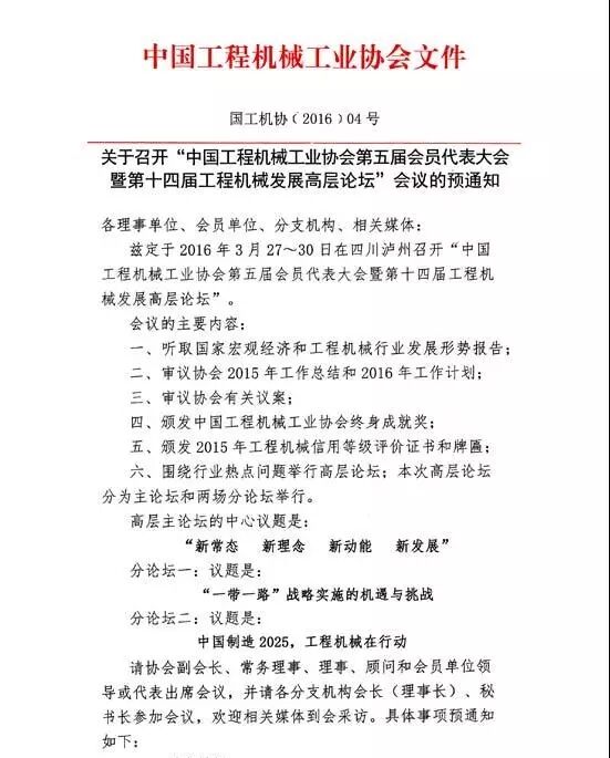 茲定于2016年3月27日~30日在四川瀘州召開“中國工程機(jī)械工業(yè)協(xié)會(huì)第五屆會(huì)員代表大會(huì)暨第十四屆工程機(jī)械發(fā)展高層論壇”。