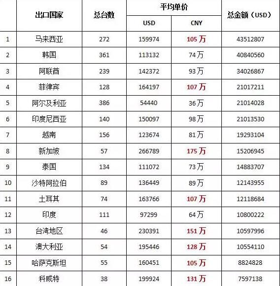 2015年1—11月我國(guó)塔機(jī)出口3098臺(tái),同比減少14.68%,出口金額達(dá)到39303.24萬(wàn)美元,同比減少6.95%,預(yù)計(jì)全年出口3300臺(tái)左右,相比國(guó)內(nèi)市場(chǎng)接近50%的銷量跌幅,塔機(jī)出口成績(jī)可嘉。尤其2015年上半年相比去年同期增長(zhǎng)了16.7%,但從7月份開始逐月走低。從近10年的區(qū)域占比來(lái)看,中國(guó)塔機(jī)出口的市場(chǎng)一直由亞太地區(qū)市場(chǎng)占據(jù)絕對(duì)主力,從近三年的數(shù)據(jù)可以看出,雖然歷年各國(guó)排名都有變化,但除了俄羅斯聯(lián)邦、土耳其、巴西、阿爾及利亞等國(guó)家外,其他列于榜單中的國(guó)家全部位于亞洲區(qū)域,顯而易見,我國(guó)塔機(jī)出口主要市場(chǎng)依舊是亞洲等發(fā)展中國(guó)家。(具體參見下圖:2015年1—11月塔機(jī)出口數(shù)據(jù))