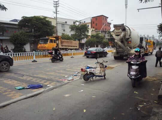 據(jù)了解,元華路是福清市區(qū)通往元洪投資區(qū)一條重要交通主干道,平時來往的車流量眾多。昨日下午1時許,記者趕到現(xiàn)場看到,一輛車牌號為閩DB9072的混凝土車仍停在現(xiàn)場,慘遭碾壓的女子和小女孩已被運(yùn)走。民警仍在現(xiàn)場調(diào)查,現(xiàn)場的血跡已用沙土覆蓋,電動車車頭已嚴(yán)重變形。