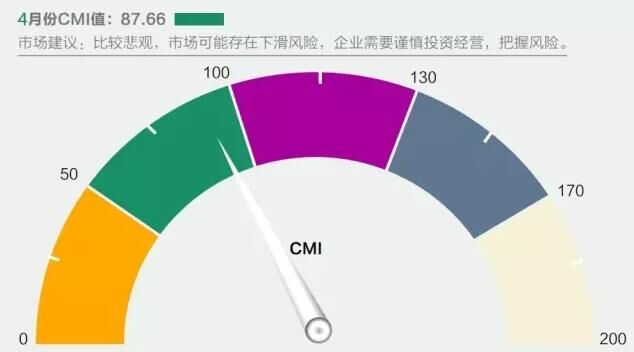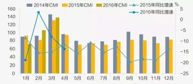 2016年4月份中國工程機(jī)械市場指數(shù)即CMI為87.66,同比增速-7.27%,環(huán)比增速-35.67%(依據(jù)CMI判斷標(biāo)準(zhǔn),CMI在50~100之間,表示市場比較悲觀,可能存在下滑風(fēng)險)。