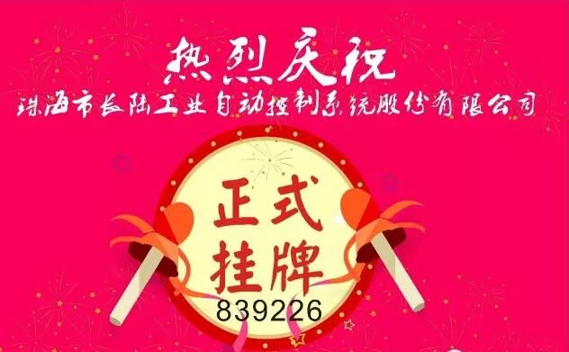 9月13日,珠海市長陸工業(yè)自動(dòng)控制系統(tǒng)股份有限公司在全國中小企業(yè)股份轉(zhuǎn)讓系統(tǒng)(簡稱“新三板”)正式掛牌,證券簡稱為“長陸工控”,證券代碼為“839226”。