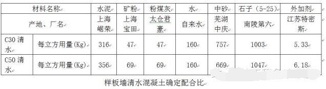 最終,第四段樣板墻實(shí)踐完成后,根據(jù)業(yè)主、監(jiān)理、設(shè)計等各方的意見最終明確正式清水混凝土施工的配合比: