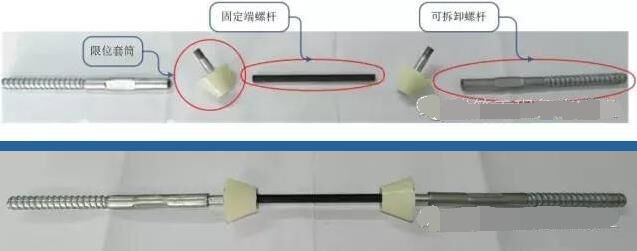 根據(jù)對日本已完清水混凝土工程考察結(jié)果,日方在施工中均采用三接頭的對拉螺桿,施工中有效解決了螺桿眼部位的失水漏漿的問題,有效避免了熊貓眼的發(fā)生。為了有效保護(hù)清水模板的表面,通過多輪試驗(yàn)對比,特別研制出了五段式對拉螺桿。