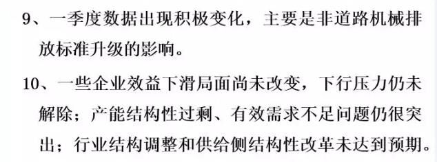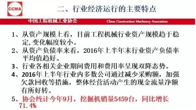 我個(gè)人總結(jié),今年的運(yùn)行情況有這樣十個(gè)方面。第一,從整個(gè)全行業(yè)各企業(yè)的資產(chǎn)規(guī)模上看,目前趨于穩(wěn)定,變化幅度很小,不像前兩年振動(dòng)那么大。第二,從資產(chǎn)負(fù)債率來(lái)說(shuō),現(xiàn)在負(fù)債率是在60%左右,全國(guó)的工業(yè)企業(yè)是56%。所以,這個(gè)行業(yè)的資產(chǎn)負(fù)債率目前看也是很好的。這個(gè)需要引起大家的關(guān)注和分析,我們也希望后幾個(gè)月情況可以穩(wěn)定向好。還有自主品牌市場(chǎng)占有率,在國(guó)內(nèi)市場(chǎng)還是保持高位,從全行業(yè)來(lái)看在90%以上。那么,產(chǎn)業(yè)的集中度又進(jìn)一步地增強(qiáng)了,但有一些企業(yè)挺無(wú)助的,出局了,進(jìn)口額下降。今年按照環(huán)保部5號(hào)令,全行業(yè)工程機(jī)械產(chǎn)品實(shí)現(xiàn)了新的標(biāo)準(zhǔn)升級(jí)。整個(gè)產(chǎn)品進(jìn)行了更新?lián)Q代,這個(gè)非常難能可貴。最后是產(chǎn)能結(jié)構(gòu)性過(guò)剩,有效需求不足問(wèn)題仍然突出,行業(yè)結(jié)構(gòu)調(diào)整還有供給側(cè)結(jié)構(gòu)改革遠(yuǎn)遠(yuǎn)沒(méi)有達(dá)到預(yù)期。即便是按照現(xiàn)在的挖掘機(jī)銷(xiāo)量5500多臺(tái),就算是6000臺(tái),產(chǎn)能又有多少?一旦市場(chǎng)回暖,一些企業(yè)家還是會(huì)頭腦一熱,這樣大一個(gè)產(chǎn)能釋放出來(lái)的產(chǎn)量是什么局面?我們必須保持一個(gè)清醒的頭腦。