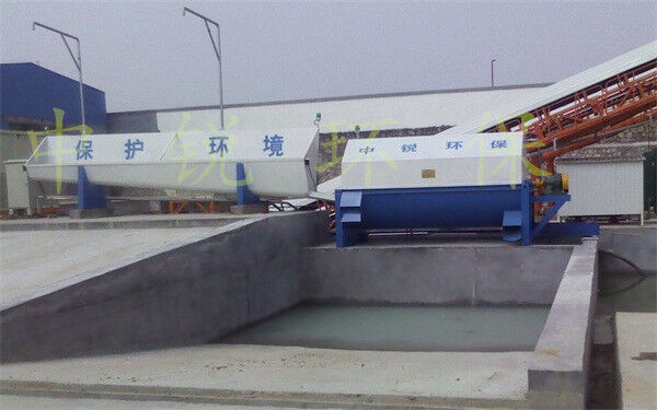 該系統(tǒng)主要由:攪拌車(chē)加水清洗裝置,溜槽輸送裝置,砂石漿水分離裝置,和泥漿水后處理裝置組成。混凝土輸送設(shè)備清洗后,將殘余混凝土排入溜槽中,在高壓水流沖擊下,經(jīng)溜槽進(jìn)入砂石分離機(jī),在不斷旋轉(zhuǎn)的分離機(jī)作用下,對(duì)混凝土進(jìn)行充分的清洗,同時(shí)將砂、石進(jìn)行分離,分離后的砂、石在導(dǎo)料葉片的作用下背向流動(dòng),再通過(guò)提升式出料口排出分離機(jī),分別堆放。清洗后的漿水從分離機(jī)的底部排出進(jìn)入沉淀池逐級(jí)沉淀后循環(huán)使用或進(jìn)入攪拌池回收利用。進(jìn)入攪拌池(一般情況2個(gè)攪拌池)的漿水為了防止沉淀凝固,需通過(guò)攪拌器的作用,攪拌器的工作為間歇式。分離出水泥漿在連續(xù)的攪拌器作用下,再通過(guò)高壓污水泵輸送到攪拌樓中待生產(chǎn)計(jì)量再利用。整個(gè)控制系統(tǒng)設(shè)有手動(dòng)和自動(dòng)控制,方便控制設(shè)置,整個(gè)系統(tǒng)運(yùn)行可靠,故障率低,維護(hù)量少等特點(diǎn)。