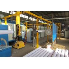 布料機(jī)專利設(shè)計(jì)的膠帶機(jī)頭部清掃器是為輸送混凝土清掃砂漿的特殊要求設(shè)計(jì)的。刮刀采用硬質(zhì)合金材料,矩型段面,耐磨且不傷膠帶,砂漿損失小。上料膠帶機(jī)設(shè)計(jì)為由兩節(jié)輕型桁架的鉸接結(jié)構(gòu),上端鉸接在車架上的轉(zhuǎn)料斗上,通過鉸接油缸根據(jù)需要調(diào)整兩節(jié)桁架之間的角度;在膠帶機(jī)的下部,設(shè)計(jì)有萬向輪,在油缸的驅(qū)動下可沿桁架軸向移動,可調(diào)整膠帶尾部的高度。