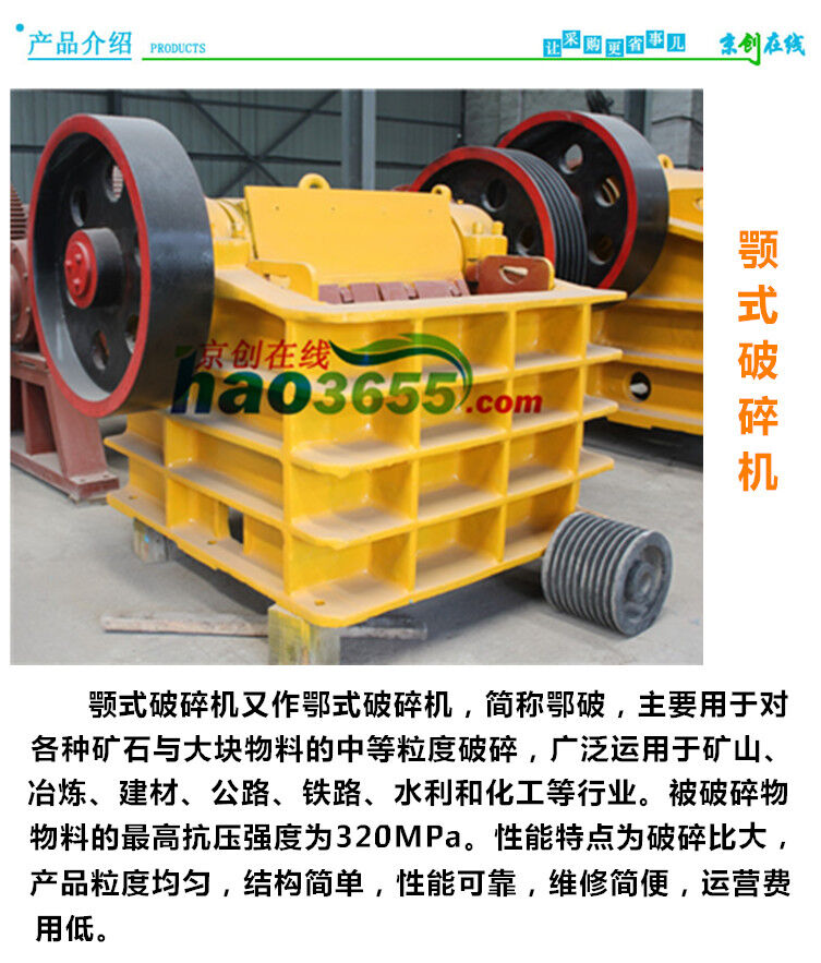 顎式破碎機(jī)在礦山、建材、基建等部門主要用作粗碎機(jī)和中碎機(jī)。按照進(jìn)料口寬度大小來(lái)分為大、中、小型三種,進(jìn)料口寬度大于600MM的為大型機(jī)器,進(jìn)料口寬度在300-600MM的為中型機(jī),進(jìn)料口寬度小于300MM的為小型機(jī)。顎式破碎機(jī)結(jié)構(gòu)簡(jiǎn)單,制造容易,工作可靠,使用維修方便。
