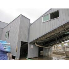 2)料倉棚:立柱采用450*5角鋼,立柱角鋼間的橫向聯(lián)系及斜撐采用∠30角鋼;拱架采用Φ48*2mm鍍鋅鋼管,斜撐及聯(lián)系采用Φ21*1.5mm鍍鋅鋼管及∠30角鋼。屋面檁條采用12#鍍鋅C型鋼。屋面彩鋼棚采用0.3mm厚藍色彩鋼板,頂棚排水采用630*1.2mm鍍鋅檐溝。