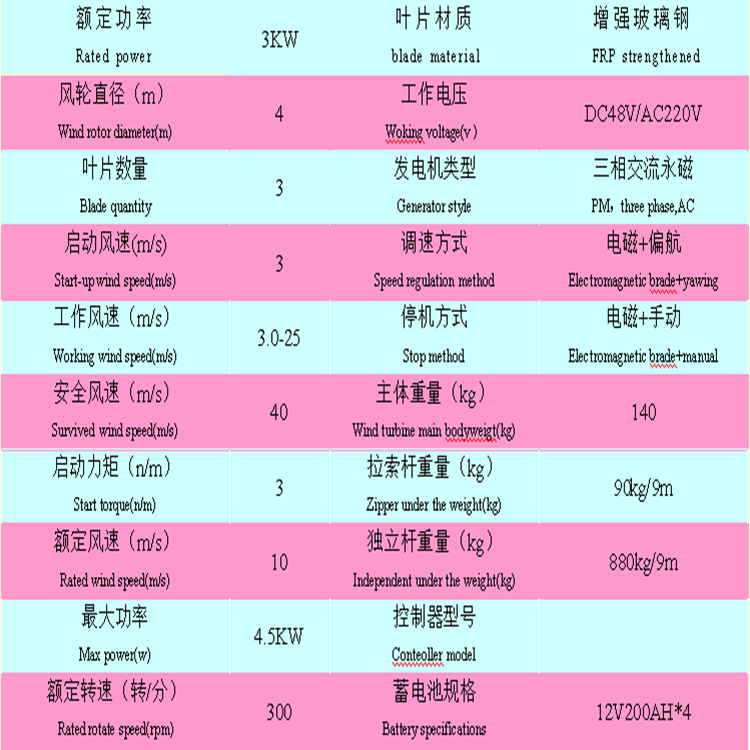 sc-3kW風力發(fā)電機技術參數