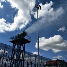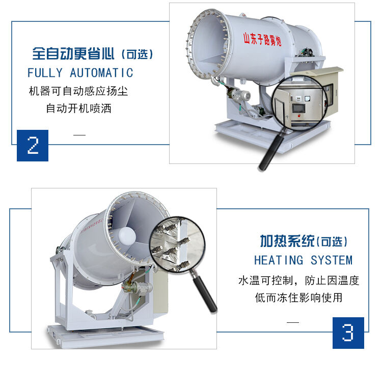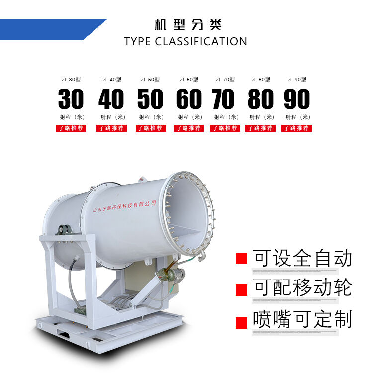 直徑相近的水霧和的粉塵顆粒黏貼,減小水表面的張力,使粉塵顆粒與水霧聚結(jié)成團,在重力作用下,然后沉降到地面。達到有效降塵的目的。霧炮機的噴水距離為30到150米,具體規(guī)格可以定制,配套水箱可選3-10噸,主要作用是噴霧抑塵,