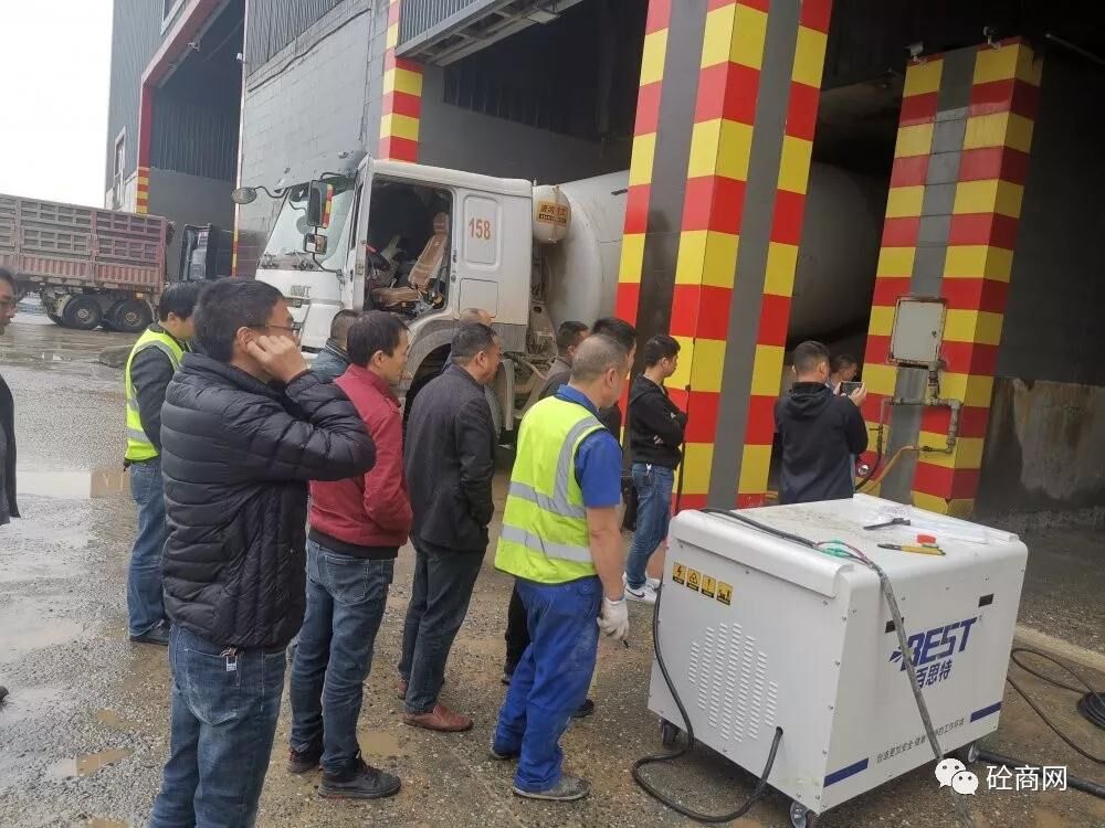 小編按照約定時間剛到現(xiàn)場,就看到熱心的楊站長召集了臨近的幾家攪拌站站長早已在我們的攪拌站高壓清洗機旁等候,都想一睹高壓清洗機的“威懾力吧!