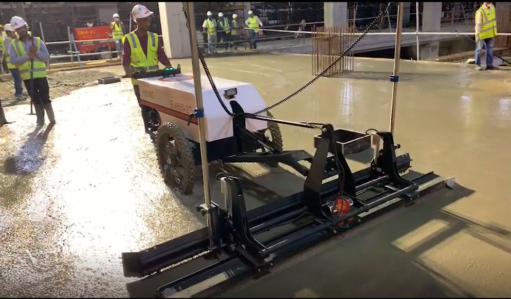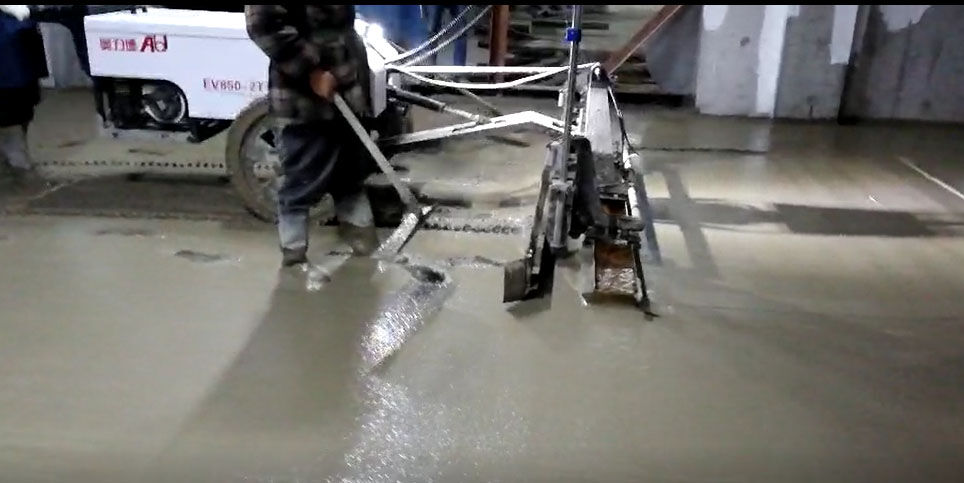 混凝土激光攤鋪機是用刮板將高出的混凝土帶走并初步刮平,達到設(shè)計要求的標高。液壓驅(qū)動振動馬達產(chǎn)生震動,頻率為4000次/分鐘,帶動整個振動板一起對混凝土產(chǎn)生振搗。激光攤鋪機找平不需要拉控制線,也不需要支側(cè)模板來控制地面標高,而由攤鋪機上的激光測控系統(tǒng)實時控制,只要激光發(fā)射器不受干擾,無論攤鋪機移動到哪里,都能確保鋪筑后的地面整體上的標高不受影響。