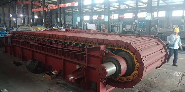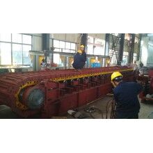5、頭尾輪應采用優(yōu)質鑄鋼件并經(jīng)良好的熱處理,應帶有張緊裝置。喂料倉與板喂機之間應設有溜槽,板喂機帶支架和支腿。
